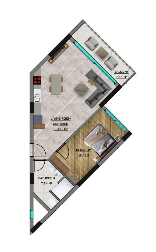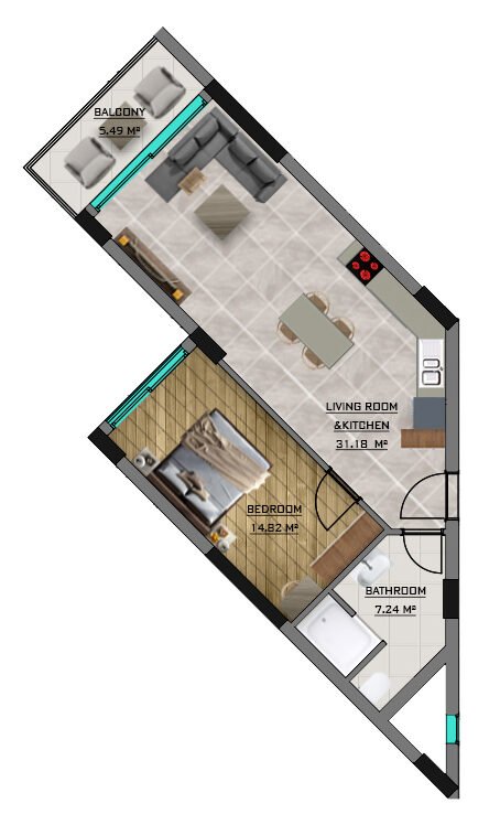 Апартаменты 1+1. Просторный балкон с выходом на 2 стороны